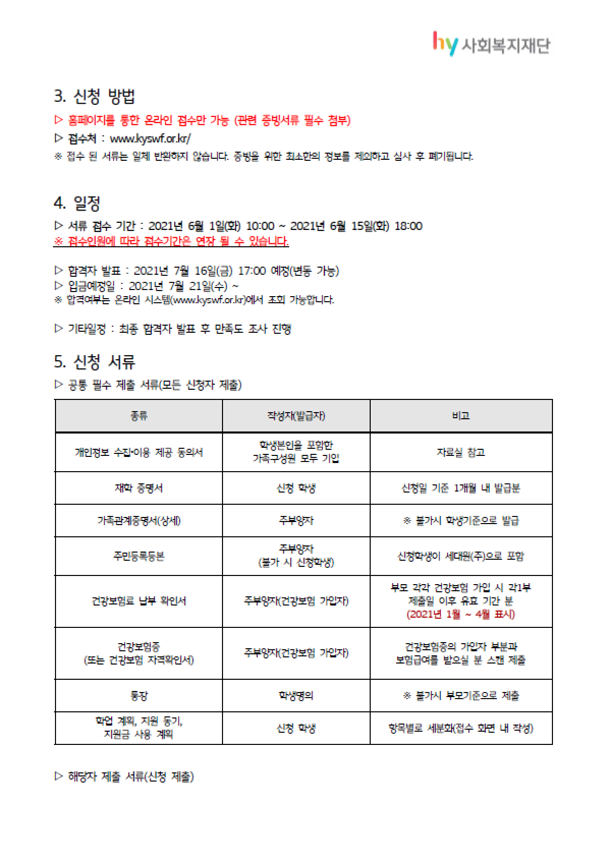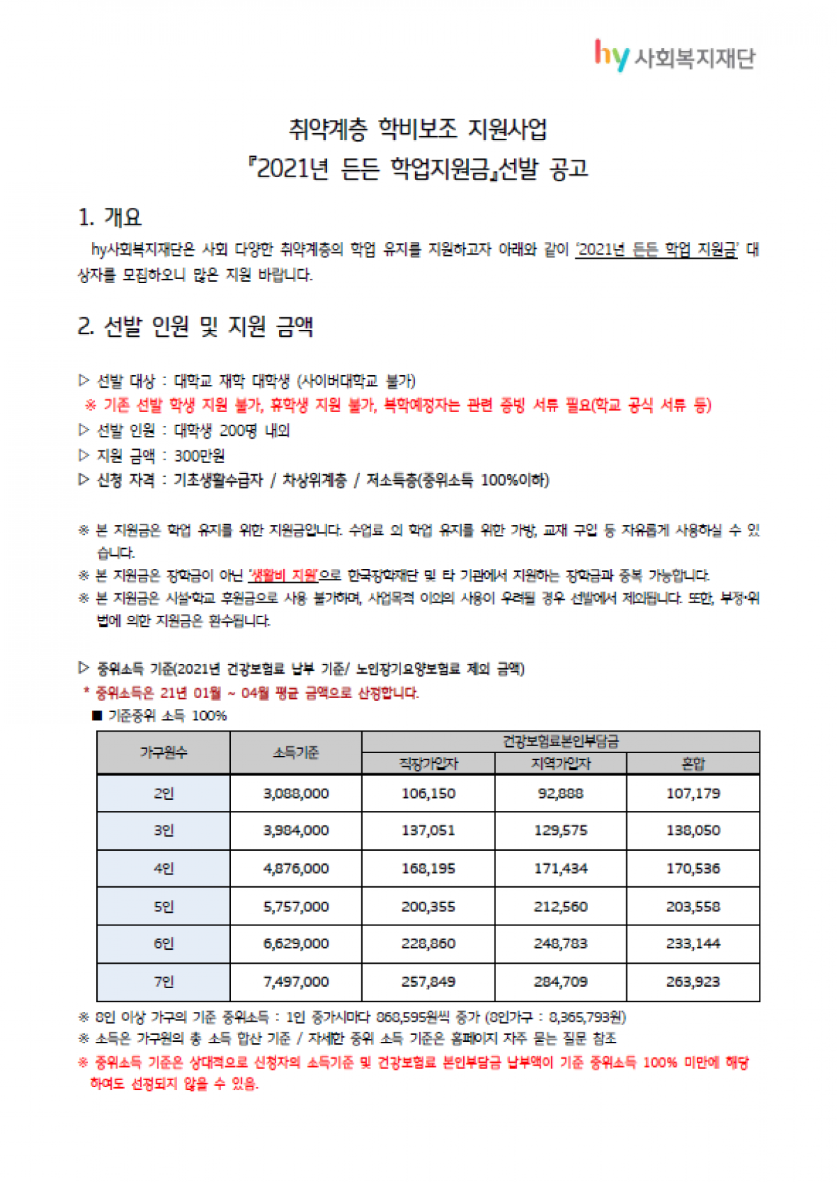 우리 재단은 취약계층의 학업 유지를 위하여 '2021년 든든 학업 지원금' 을 실시합니다. 자세한 내용은 붙임의 '2021년 든든 학업지원금'공고문을 참고하시기 바랍니다.